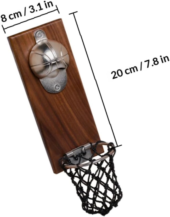 Package List 1 x basketball bottle opener Features -Color: Coffee. -Product Info:Basketball bottle opener -Size: About 20.00X8.00X2.00cm/7.86X3.14X0.79inch. -Material: Stainless Steel. - It is and easy to open the bottle without any effort Magnetic Refrigerator Bottle Opener. - A practical decoration of your house. A nice to your friends or family. Basketball Bottle Openers - A perfect accessory for any beer lover in your life. for party, banquet, wedding, KTV and more. Beer Opener - You can install it on any wall or any place you like, not only indoors, but also outdoors, in the kitchen, on front porch etc. Bottle Opener - The basketball board mesh can be used to collect bottle covers, which is practical and convenient. Wall Mounted Wine OpenerGoods InformationWall Mounted Wine Opener With the handmade woven mesh, the catcher becomes creative, super cool and unique.Cartoon Bottle Opener NOTE:This product is not suitable for .Stainless Steel Opener This wall mounted bottle opener is made of selected wood and stainless steel, which is vintage, textured, corrosion resistance and steady.Basketball Bottle Openers Comes with a smooth and three very strong , easy to install it on any metal surface