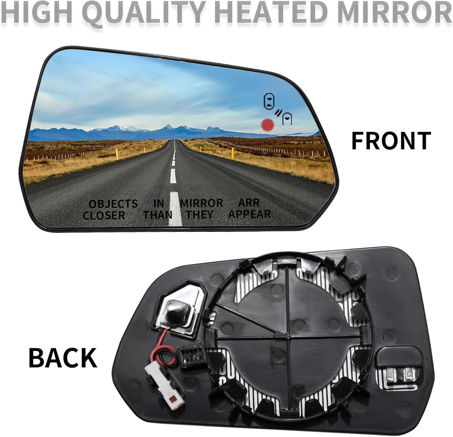 • Right Passenger Side Mirror Glass Replacement With Heated and Blind Spot Detection Function: The glass back of this passenger mirror replacement is designed with heated function, which can eliminate fog and melt ice and snow by heating from the inside out. Note: This glass has heating function, blind spot detection, no signal light, no anti-glare function and no automatic dimming function
